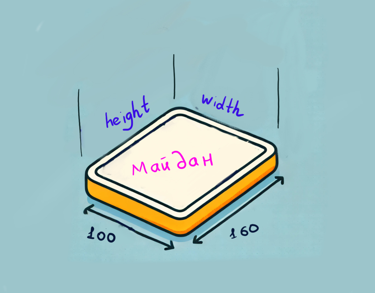 }Бул жерде, width менен height төрт тәрепли жердиң енине ҳәм кесесине узынлығын билдиреди. Екеўинин көбеймеси майданға тен.