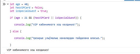 // Нәтийже: "VIP кабинимизге хош келдиңиз!"age > 21 && (hasVIPCard || isSpecialGuest) - усы коуд қатары үш турли шәртти AND (&&) деген оператордың еки тәрепинде тексерип атыр.