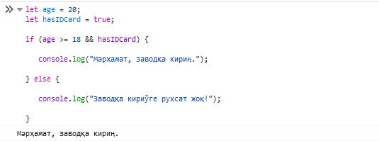 // Нәтийже: "Мәрҳамат, заводқа кириң."Жоқарғы коудта "age>=18" ҳәм hasIDCard деген шәрт екеўи де шынлық (true). Соңлықтан if қаўсырманың ишиндеги && оператор true деген мәнисти қайтарады ҳәм "Заводқа кириң" деген жазыў көринеди.