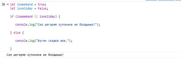 // На’тийже: "Сиз шегирме купонына ийе болдыңыз!"Усы жерде isWeekend ("қала күниме?") деген айныўшымыз ҳақыйқат. isHoliday ("байрамба?") деген айныўшымыз өтирик. Кем дегенде бир айныўшымыз рас болса, коуд иске қосылады ҳәм бизлер шегирме купонына ийе боламыз.