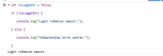 Енди, isLoggedIn айныўшыны true деп алайық. "Логин қылып вебсайтқа кирген" пайдаланыўшы деп келтирдик. Энди !isLoggedIn деген айныўшы "логин қылмағаны распа?" деп сорап тур. Яқ, бул ретки пайдаланыўшымыз логин қылыпты. Демек, isLoggedIn false мәнисин қайтарады ҳәм жоқарыдағы коудтың else бөлими иске қосылады. Экранда "Пайдаланыўшы логин қылған" деген жазыў пайда болады.