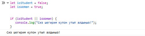 Демек, OR (||) деген оператордың еки тәрепинде бир шәрт болса да шынлық болса, оператор шынлықты қайтарады.