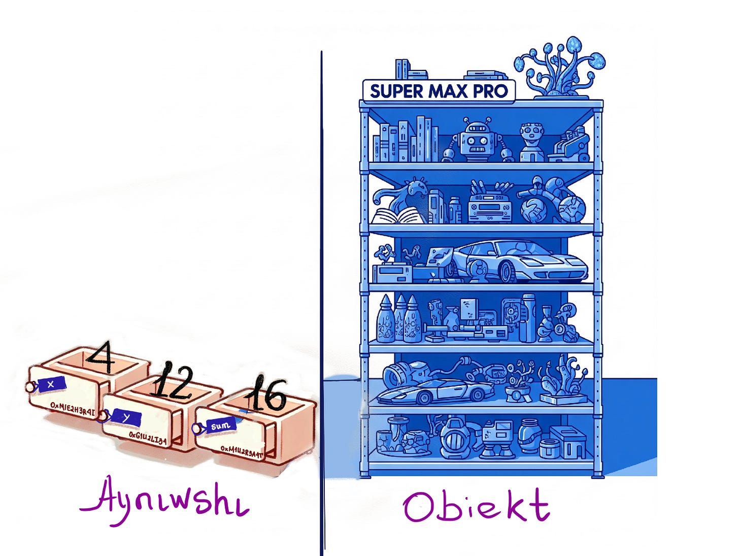 Қалай сонда? Тартпаны көз алдыңызға келтириң. Алдын ишине бир дана зат қоя алатуғын едик. Енди, Супер Макс Про тартпаны көз алдыңызға келтириң. Енди усы тартпаның ишине қәлегенимизше, ҳәр түрли зат қоя аламыз. Ҳәм усы супер макс про тартпаны объект деп атаймыз. (Айныўшы емес.)