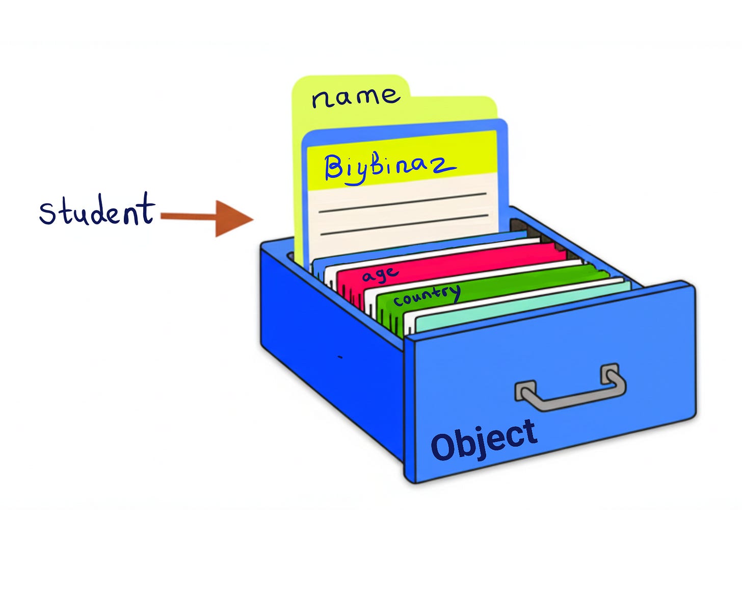 Объектти қандай затқа мегзесек болады? Шкафтың ишинде турған документлерди елеслетип көриң. Документтиң сыртында атамасы жазылған болады. Документтиң ишинде файл бар. Бир нәрсе керек болса, документтиң атын излеп таўып алыў аңсат.